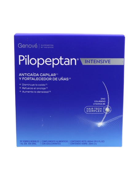 Pilopeptan Intensive es un complemento alimenticio en formato bebible. Su formulación avanzada actúa desde el interior de tu organismo, aportando los cimientos moleculares necesarios para fortalecer, nutrir y revitalizar intensamente tu cabello y tus uñas.